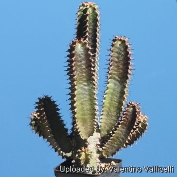 Plante succulente, cactiforme, au port dressé, atteignant m de haut avec de nombreuses tiges épaisses, épineuses, vert brillant.
